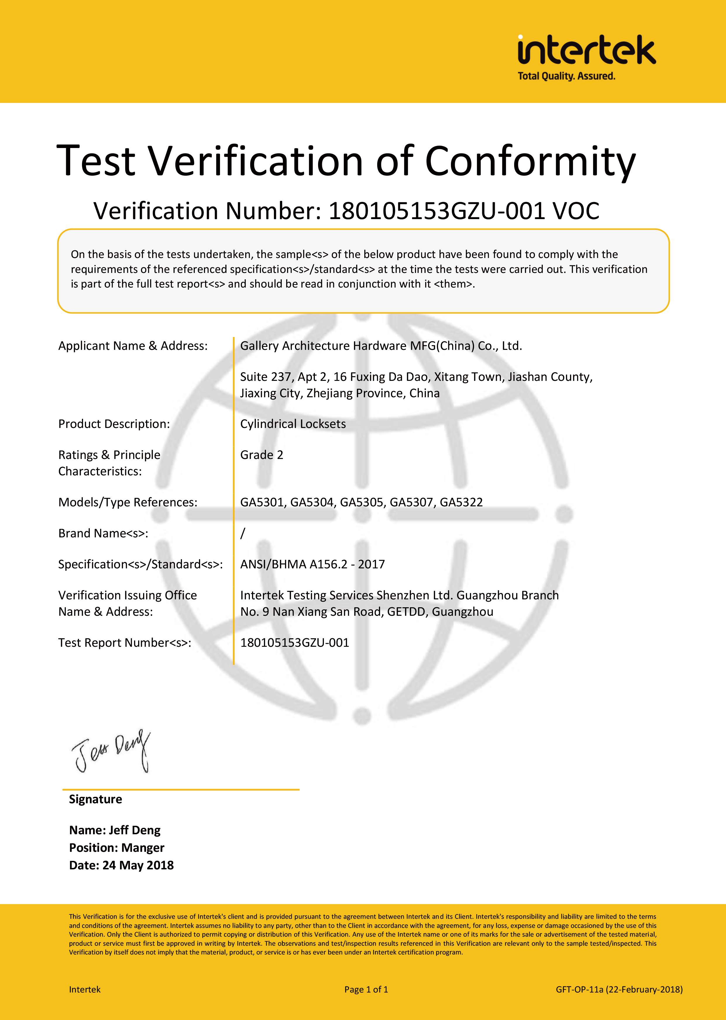 浙江堅迪五金制造有限公司始建于 1995 年。自 2003 開始,公司致力于高標準商業鎖的研發工作,并于 2006 及 2007 年,8700 插芯鎖系列獲得美國國家標準 ANSI A 156.13-2005 一級、ANSI A 156.2-2003 二級和美國 UL 10C3 小時防火測試認證。自 1998 年以來,公司不斷提升產品和客戶服務品質,并獲得了 ISO 9001 的認證。